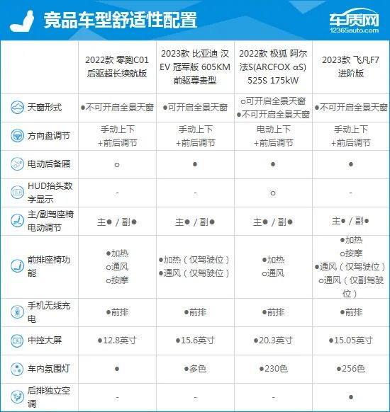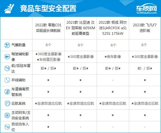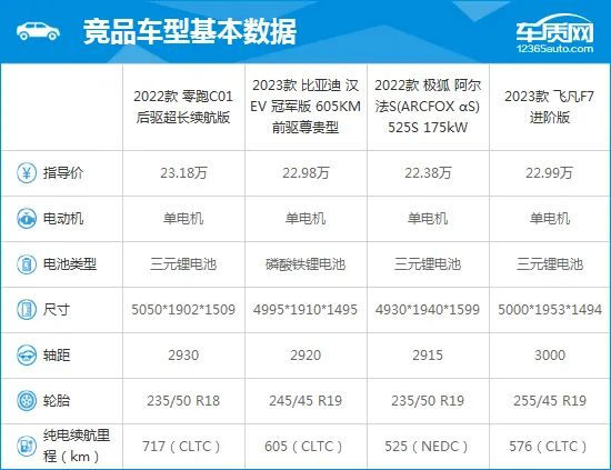 从竞品车型来看,零跑C01在市场中的主要竞争对手为比亚迪汉EV、极狐阿尔法S以及飞凡F7等。通过配置对比来看,在价位相近的前提下,零跑C01的续航能力较为出色,同时在安全配置方面更为完善。此外,在车身尺寸方面,零跑C01在车身长度和轴距方面具有一定优势,乘坐空间能得到充分保障。