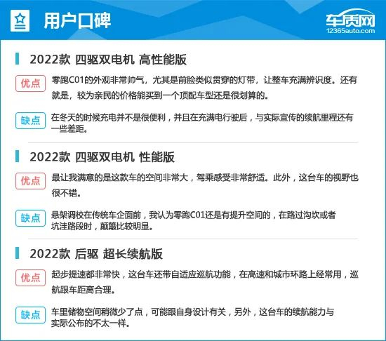 在用户口碑中,多数车主对2022款零跑C01的外观设计和空间表示满意,还有部分车主认为该车的悬架调校和续航表现还有提升空间。