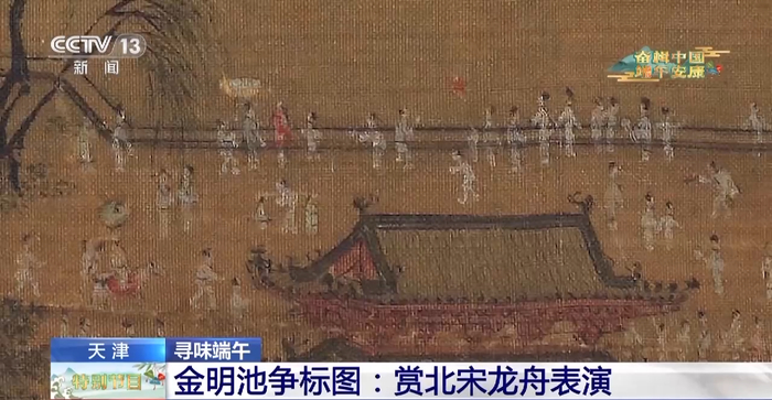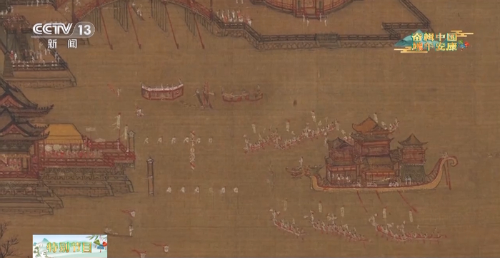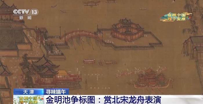 天津师范大学博物馆与艺术鉴藏研究中心主任 陈晨:这些表演有很多种,在当时《东京梦华录》中记载有一种叫做“旋罗”,实际上是龙舟围成一个圈不停地旋转,还有一个叫“海眼”,红旗挥舞一下,就变成两队了,然后各自又组成一个新的圈,然后又将红旗再继续挥舞,两队的龙船就互换了一下位置,这就叫做“交头”。非常有意思,具有一定的观赏性跟民俗性。