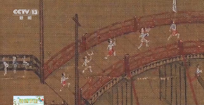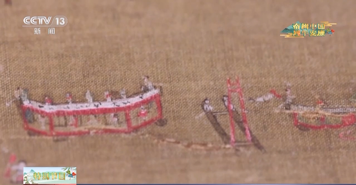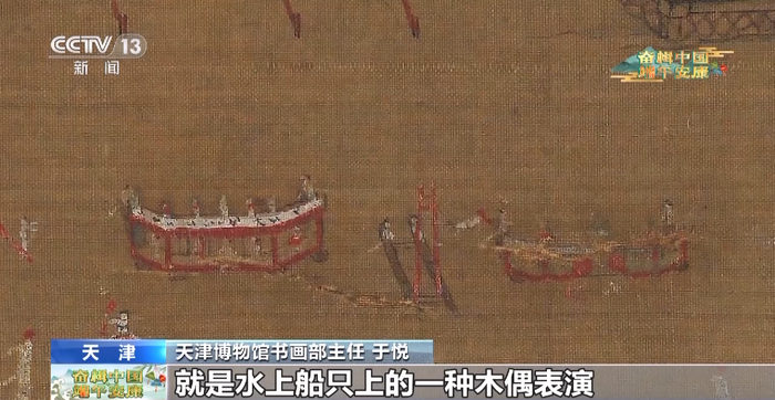 天津博物馆书画部主任 于悦:我们可以看到画得很细致的水傀儡,就是水上船只上的一种木偶表演,旁边是水秋千表演,像我们后世这种杂技,当时可能叫百戏,在文献记载里,最后秋千上荡秋千的人会从最高处跳到水中,它实际上也是比较早的一种跳水表演。