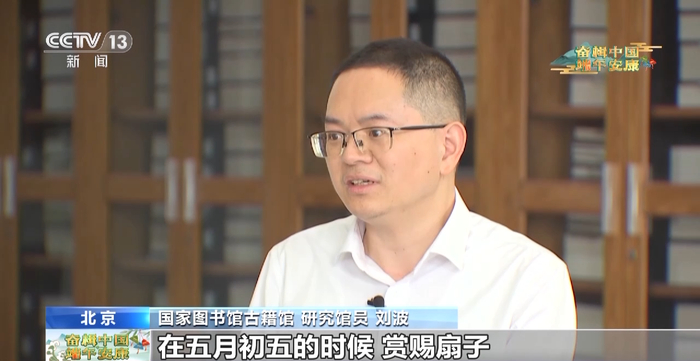 国家图书馆古籍馆 研究馆员 刘波:《唐会要》里头就记载,唐太宗曾经就给他的大臣在五月初五的时候,赏赐扇子,(并说)庶动清风,以增美德。他这个话其实是有双关的含义,扇子可以送给人凉风、清风,让人觉得凉爽,另外一层意思希望清明廉洁的政风,推广到天下。