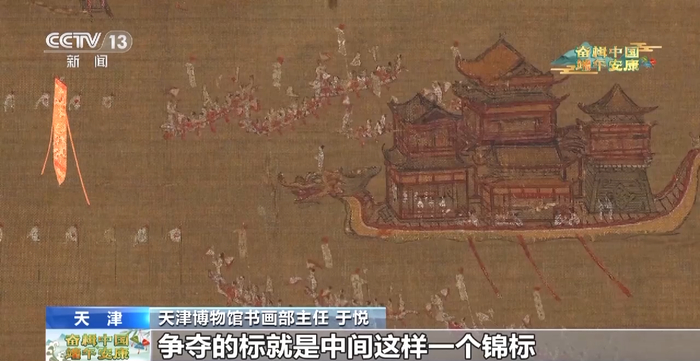 天津博物馆书画部主任 于悦:龙舟争标的主体是大龙舟,它的两边分别描绘了5艘小龙舟,争夺的是中间这样一个锦标。画面上每艘小龙舟上都有桨手,船尾有舵手,在船头立着一个军校,他们面对着桨手,实际上起到鼓手的作用。