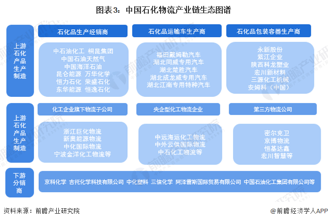 石油物流上游参与者主要为石化品生产商、石化品运输车生产商与石化品包装容器生产商。其中石化品生产商主要代表企业有中石化、中石油、桐昆集团、万华化学等;石化品运输车生产商主要有福田戴姆勒汽车、湖北同威专用汽车、湖北楚胜汽车等;石化品包装容器生产商代表有永新股份、紫江企业、陕西科龙塑业等。