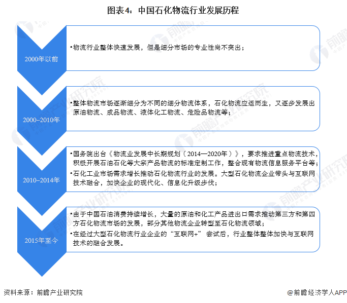 2000年以前,物流行业整体发展较快,细分市场较不明确;2000-2010年期间开始明确细分物流领域的概念,石化物流应运而生,发展出原油物流、成品物流、液体化工物流、和危险品物流等细分领域;2010年起,石化物流行业受石化市场的发展推动,另外国家政策层面开始鼓励物流行业的互联网技术融合发展,大型石化物流企业亦开始领头利用自身的研发优势与互联网技术融合发展;自2015年以来,随着中国对石化产品的需求不断增大,中国原油加工的能力也日益增强,石化工业产品对外出口量也逐渐增大,石化物流的需求也随之增大,在这样的大环境下,有部分其他行业的企业跨界或转型至石化物流行业。与此同时,在经过大型企业2010-2014年与互联网融合的尝试后,石化物流行业整体加快与之融合步伐,但目前仍存在一些阻碍。