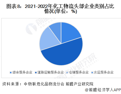 据中物联危化品物流分会数据,2021-2022年中国化工物流头部企业类别占比最多的企业类别是道路运输服务企业,其次为综合服务企业和仓储服务企业。