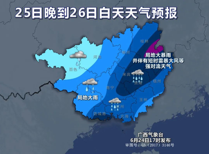 25日晚上到26日白天,桂林、贺州、来宾、贵港、梧州、玉林、钦州、北海、防城港等市及南宁市东部的部分地区有大雨到暴雨、局地大暴雨,并伴有短时雷暴大风等强对流天气,我区其他地区有小到中雨、局地大雨。