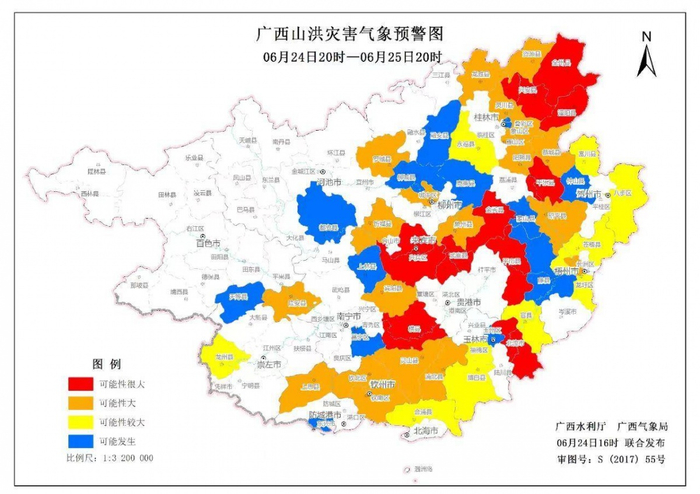 广西水利厅和广西气象局于6月24日16时联合发布山洪灾害气象预警: