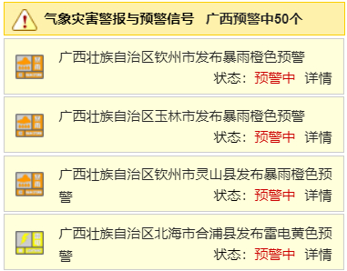 6月24日19时许,广西有50个气象灾害警报与预警信号生效中。