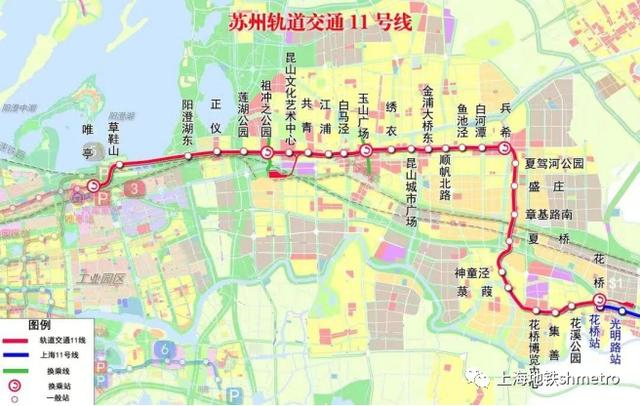 苏州轨道交通11号线全长41.25公里,设站28座,西起苏州工业园区唯亭站,与苏州轨道交通3号线换乘,东至昆山花桥站,与上海轨道交通11号线换乘。11号线是长三角一体化基础设施互联互通的示范性工程,也是国内首条与上海轨道交通网络联接的线路,将缩短苏沪之间的时空距离,更好推动长三角一体化和苏州市域一体化发展。