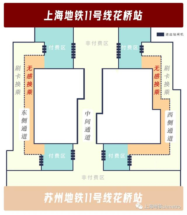如果走刷卡换乘通道(检票通道),乘客从苏州地铁线网的任一车站进入,到达11号线花桥站后,需要刷卡出闸后,按照换乘指引,通过刷卡换乘通道(检票通道),再次刷卡进入上海地铁11号线,但也无须二次安检。