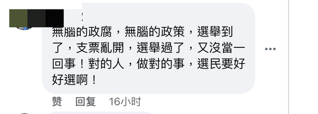 还有脸书网友发文表示:“无脑的‘政府’,无脑的政策,选举到了,支票乱开,选举过了,又没当一回事!对的人,做对的事,选民要好好选啊!”↓