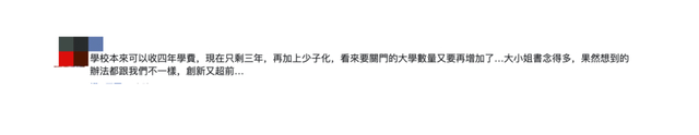 对于此消息,岛内网友讽刺:“学校本来可以收4年学费,现在只剩3年,再加上少子化,看来要关门的大学数量又要再增加了…大小姐书念得多,果然想到的办法都跟我们不一样,‘创新又超前’……”↓