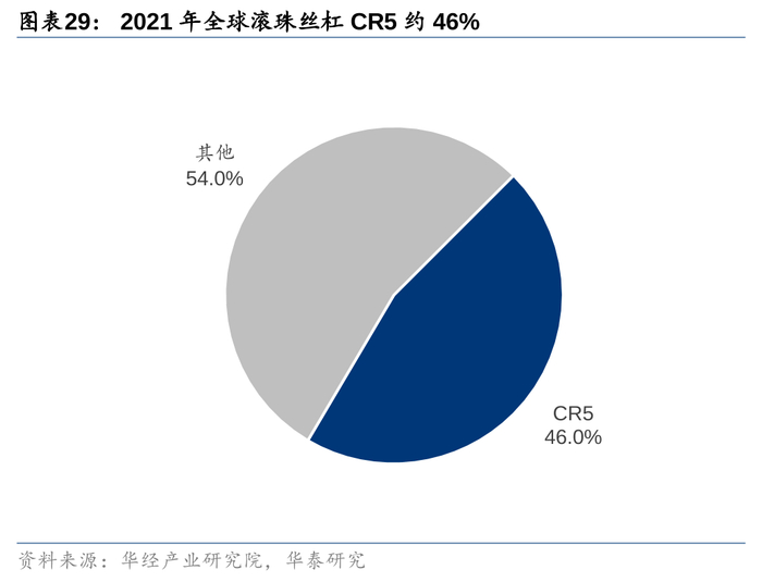 2022年全球/中国滚珠丝杠市场约为130/28亿元,日本和欧洲占据70%市场份额。根据华经产业研究院预测,2022年全球滚珠丝杠市场空间约为130亿元,中国滚珠丝杠市场空间约为28亿元。为了实现高速或精密的加工,除在机床设备的结构刚性进行加强设计外,必须同时具备高速主轴系统和高速进给系统,才能达到材料切削过程的高速化,这对于企业的制造能力和设计能力都有较高的要求。从市场竞争格局看,2021年全球主要的滚珠丝杆厂商有NSK、THK、SKF等,CR5市占率达到约46%,其中主要来自欧洲和日本,日本和欧洲滚珠丝杆企业占据了全球约70%的市场份额。国内做滚柱和滚珠丝杠的企业较少。