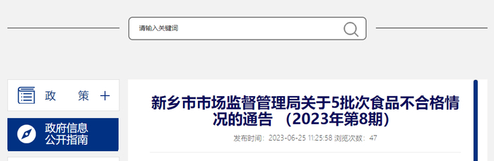 河南省新乡市市场监管局关于5批次食品不合格情况的通告(2023年第8期)