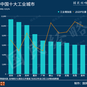 从工业增加值角度来看,产业最强的无疑是深圳、上海、苏州等城市。2022年工业增加值十强城市分别是深圳、上海、苏州、重庆、广州、佛山、宁波、无锡、东莞、泉州。