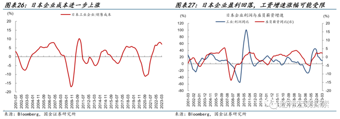 日本首相岸田文雄在公布“新资本主义”政策后,虽提出促进创新、改革劳动市场等主张,但迄今仍缺乏实施细节。截至今年5月,岸田内阁支持率已降至33%的新低。此外,居民工资收入的长期上涨依赖于企业利润的回升,日本工业企业利润增速已呈现回落趋势,增速由2021年的44%降至今年一季度的9%,在日元汇率走弱的影响下,原材料成本使企业成本增速也进一步上涨,工资增速长期抬升的基础并不牢固。