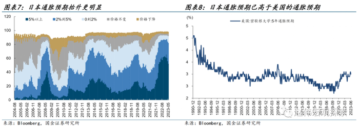 一方面,与历史上的复苏期相比,日本当前的通胀预期更高。在过去的二十年里,日本平均通胀率仅为0.2%,但当前,日本的通胀预期已上升至5%以上,根据消费者调查数据,认为未来12个月内价格上涨超5%的家庭占比已超50%。另一方面,相比以往时期,日本居民、企业部门加杠杆动力更强,日本居民杠杆率已从疫情前的63%上升到去年四季度的68.2%,日本企业杠杆率已连续四个季度扩张,至2022年四季度升至118%。
