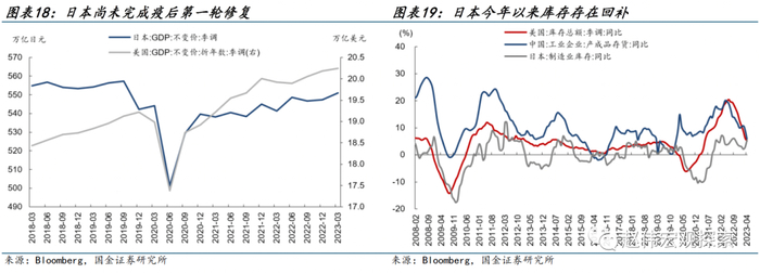 日本年初以来的企业库存回补也促成了经济改善。日本2022年10月全面放开入境管制后,目前仍受益于旅游、消费等需求的修复。日本自身疫后修复的周期也存在滞后性,当前仍处于向疫情前增速靠拢的阶段,修复具备潜力;从库存周期的角度看,疫情后,日本库存增速的虽然有所回落,但今年年初以来日本制造业企业库存增速仍有库存回补行为,且消费品与生产资料的库存增速均上涨。