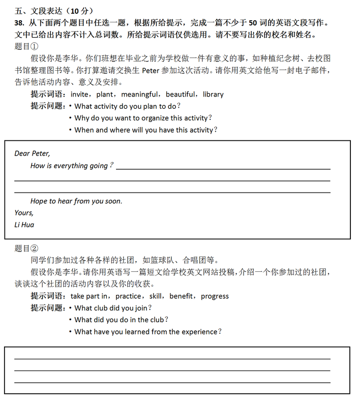 6月25日下午,初中学业水平考试英语科目落下帷幕。文段表达设置两道题目:毕业之前为学校做一件有意义的事、描述参加过的社团活动,以二选一形式供学生选择。专家表示,对两道题目,学生们都有相关的背景和生活经历,均有话可说、有感可发;考生可根据自身的实际水平自由发挥,表达切身体会和真情实感,展现自己思考问题、解决问题的思维方法和思维过程。