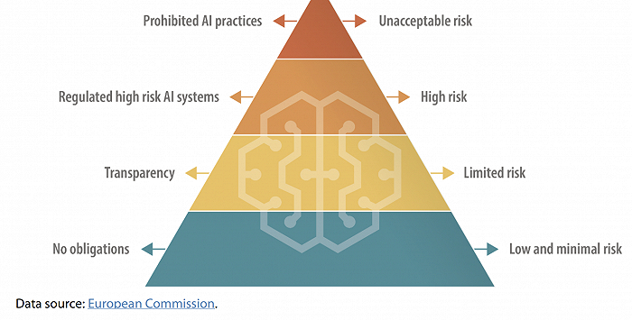该法案的基石是一套对不同AI应用风险等级判定基础上的风险分类体系,风险体系被分为四等,从高到低分别为,“不可接受的风险”、“高风险”、“有限风险”、“低风险和极小的风险”。针对不同等级的风险,实施不同程度的限制措施。