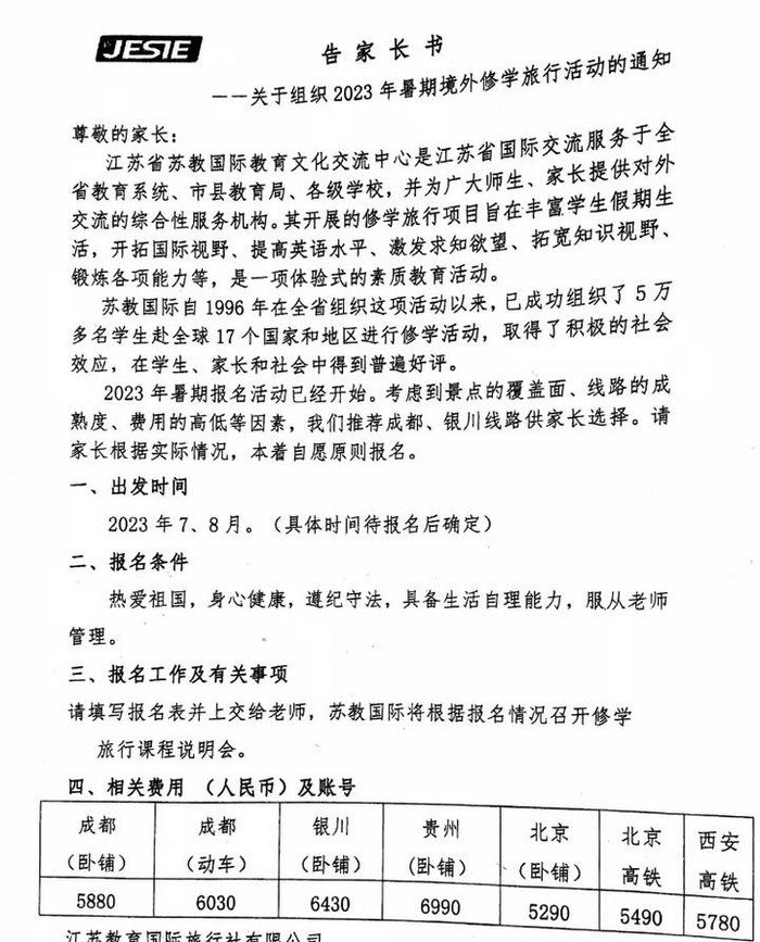 一位来自南通海门某中学的学生家长,在短视频平台直接晒出了组织2023年暑期修学旅行的告家长书。通知中显示,2023年暑期报名活动已经开始,考虑到景点的覆盖面、线路的成熟度、费用的高低等因素,决定推荐成都、银川线路供家长选择。请家长根据实际情况,本着自愿原则报名。这位学生家长吐槽道,“套路真深!”