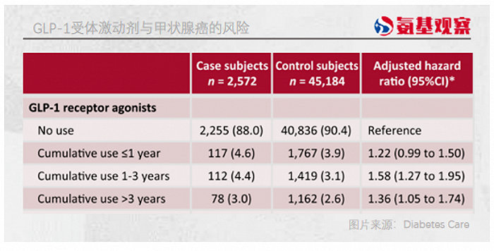 结果显示,与不使用者GLP-1类药物的患者相比,使用 GLP-1类药物1-3年或超过3年的患者高甲状腺癌发生率更高。