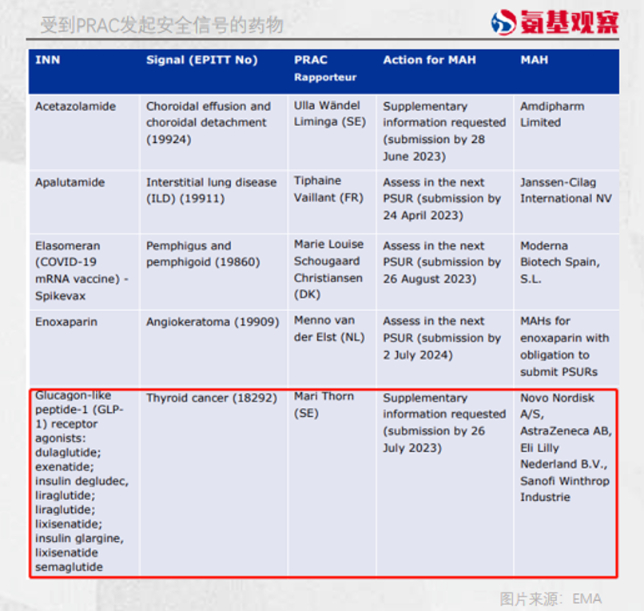 不过,最受关注的还是GLP-1类药物的潜在安全问题。EMA表示,GLP-1类药物可能导致患甲状腺癌风险升高,要求礼来、阿斯利康、赛诺菲必须在7月26日之前提供GLP-1类药物补充信息。