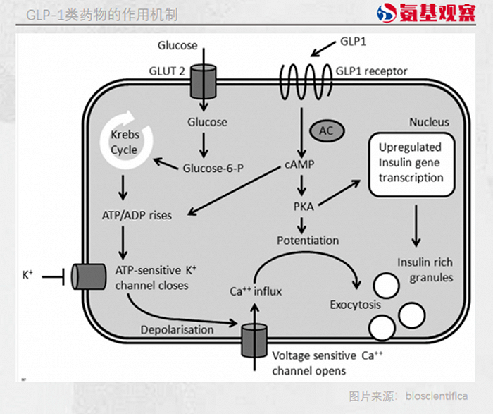体外研究显示,GLP-1受体激活会刺激胰岛素基因转录同时抑制细胞凋亡,甚至刺激细胞生长。当其长期用于治疗2型糖尿病时,GLP-1 受体途径的调节能恢复功能性β细胞群的作用,为糖尿病的治疗发挥作用。