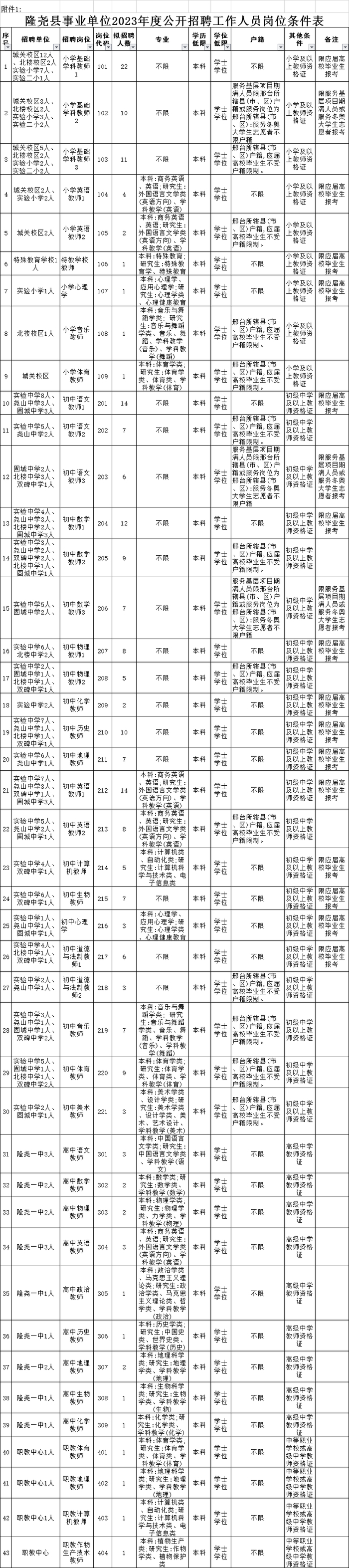 1、具体招聘人数和岗位条件详见《隆尧县事业单位2023年度公开招聘工作人员岗位条件表》(见附件1)。其中专业参考教育部《授予博士、硕士学位和培养研究生的学科、专业目录》、《普通高等学校本科专业目录(2020年版)》、《普通高等学校高等职业教育(专科)专业目录(2015年)》设置。