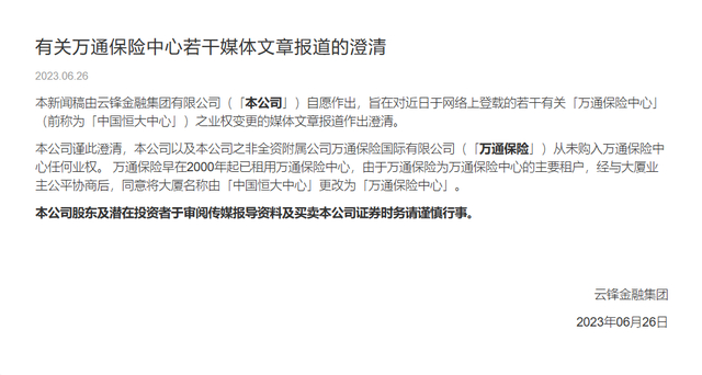 中国恒大中心更名万通保险中心,云锋金融:为主要租户,从未购入任何业权