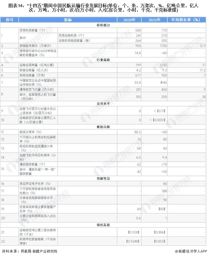 根据民航局在2022年1月发布的《“十四五”民用航空发展规划》,在2021-2025年间,我国民用航空运输行业的发展整体分为两大阶段:2021-2022年的“恢复期和积蓄期”以及2023-2025年的“增长期和释放期”。到2025年,我国民用航空运输行业将实现全方位高质量发展。