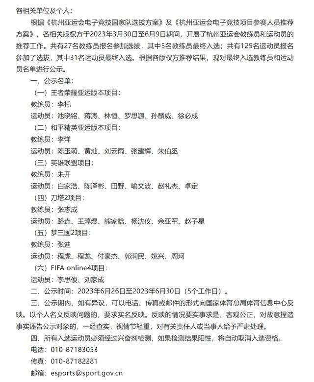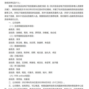 6月25日晚,国家体育总局体育信息中心公布了杭州亚运会电子竞技项目教练员和运动员参赛名单,中国代表队将参与6大电竞项目,此前由各电竞项目版权方、国内代理方推荐的集训队大名单得到大幅精简。