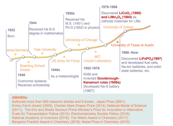 57岁时,古迪纳夫发明了钴酸锂材料作为锂电池的正极材料,1984年,61岁的古迪纳夫和他的研究小组又发现了另一种更为稳定和便宜的材料——锰酸锂。由于牛津大学有65岁强制退休的规定,但古迪纳夫不甘心,于是加入了美国得克萨斯大学奥斯汀分校,成为该校机械工程和材料科学教授,继续锂电池研究。