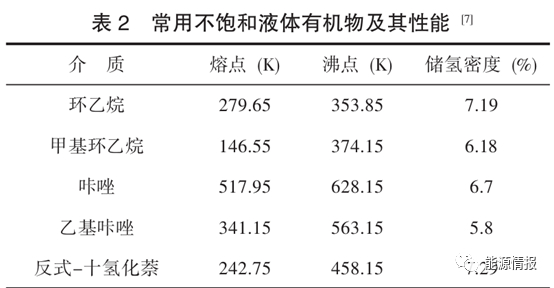 有机液态储氢是在催化剂作用下使不饱和液体有机物发生加氢反应,进而生成稳定的化合物。使用氢气时,再进行相应的脱氢反应。该过程主要分为3个阶段:第1阶段,氢气与不饱和液体有机物发生加氢反应;第2阶段,对反应后的材料进行储存和运输;第3阶段,对反应后的材料进行脱氢并释放氢气(见表2)。