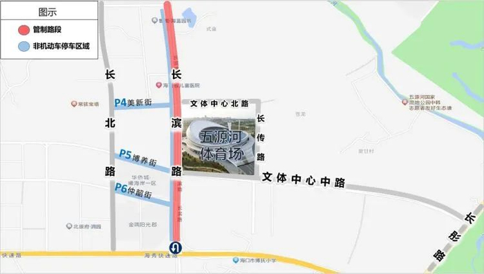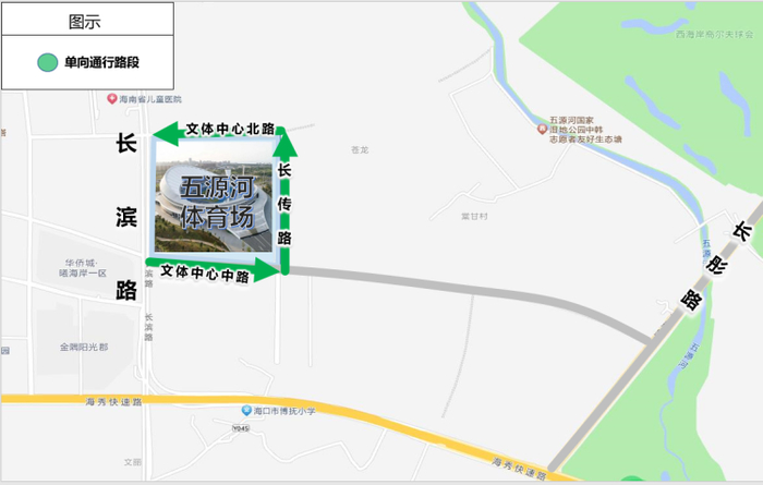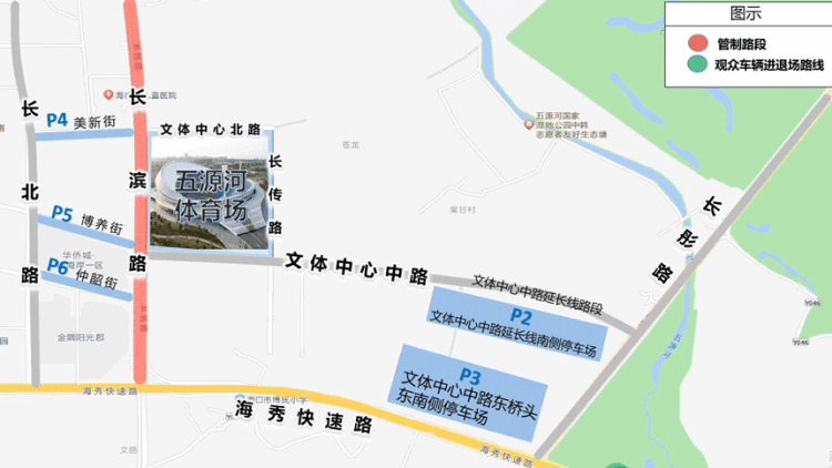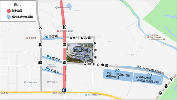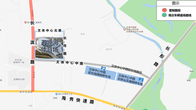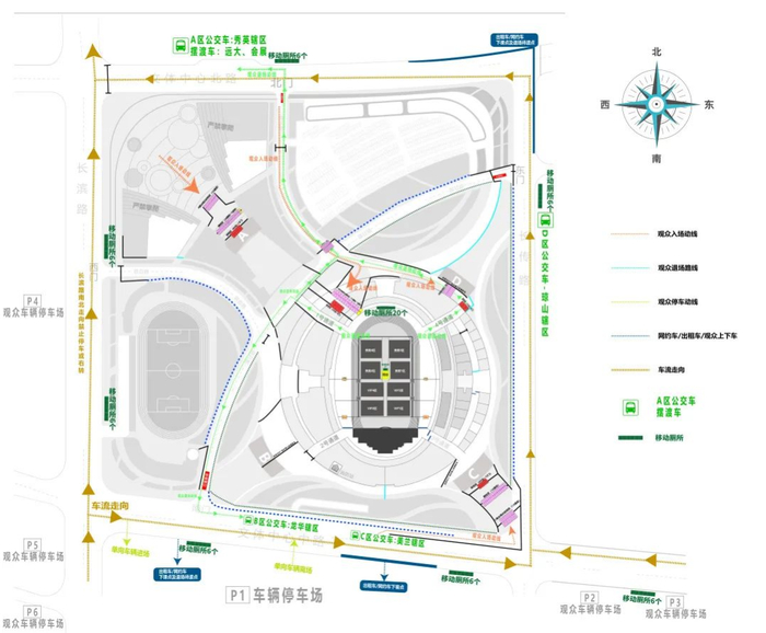 1.由长彤路→文体中心中路往西驶入的车辆,停放在文体中心中路与长传路交叉口以东的停车区域,观众步行前往体育场,由原路线(文体中心中路→长彤路)驶离退场。