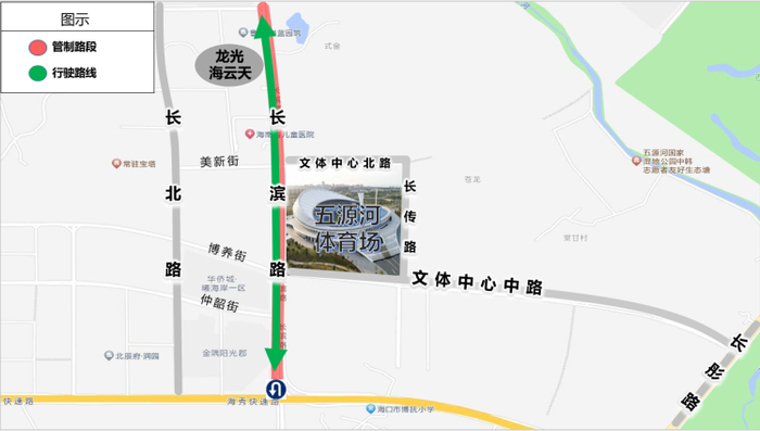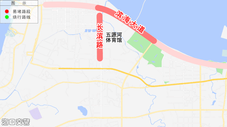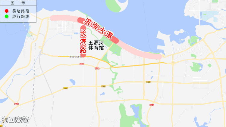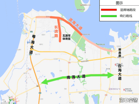 二、如滨海大道西延线交通流量大,途经车辆可绕行海秀西路-海盛路-海榆西线、南海大道、粤海大道。