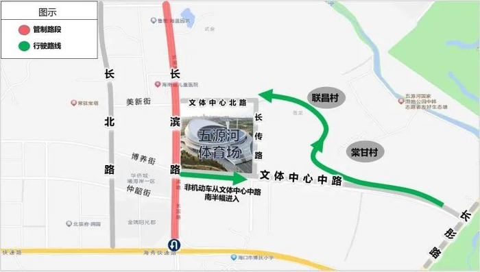 二、前往棠甘村、联昌村的社会车辆可绕行长彤路→文体中心中路→棠甘村、联昌村或从长滨路→文体中心中路→长传路→文体中心北路前往沿街村口和商铺;从长滨路进入的非机动车,可从文体中心中路南半幅通道进入。