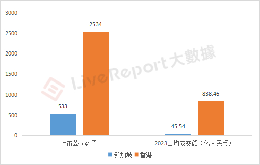 证券交易方面,截至2023年6月26日,香港上市公司数量2534家,新加坡上市公司数量为533家,香港上市公司总市值是新加坡上市公司总市值的约8倍,市场体量庞大。此外,2023年香港股票市场的日均成交额是新加坡市场的约18倍,股票市场交易活跃度更高。