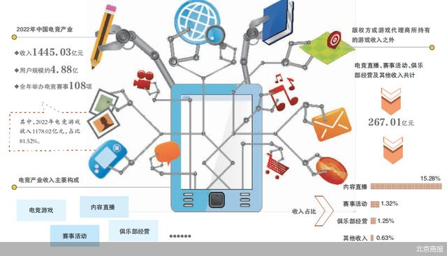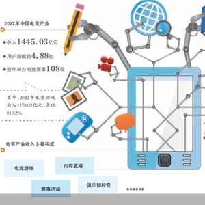 中国音数协电竞工委数据显示,2022年中国电竞产业收入1445.03亿元,电竞用户规模约4.88亿,全年举办电竞赛事108项。其中,2022年电竞游戏收入1178.02亿元,占比81.52%。