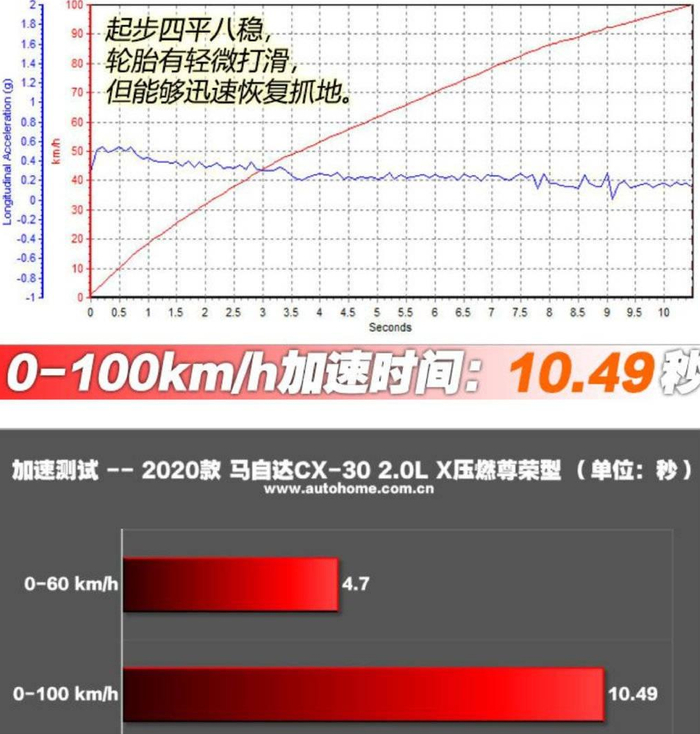 对于这个区间的燃油车消费者来说,省油其实是一个很大的痛点,国内有知名汽车网站对搭载最新的创驰蓝天X压燃发动机马自达CX-30进行了性能测试。综合路况下,CX-30百公里油耗测出了7.0L。零百加速为10.49秒。