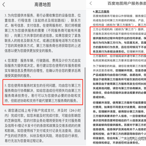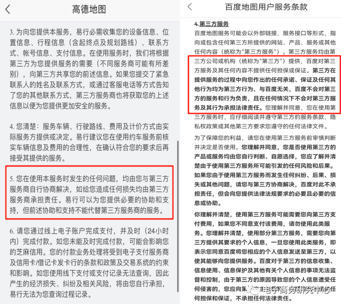 高德打车、百度地图等在其服务条款中曾出现过类似“甩锅”描述。如高德打车:“您在使用本服务时发生的任何问题,均由您与第三方服务商自行协商解决,如给您造成任何损失均由第三方服务商承担责任。易行可以为您提供必要的协助和支持,但前述协助和支持不能代替第三方服务商的服务。”