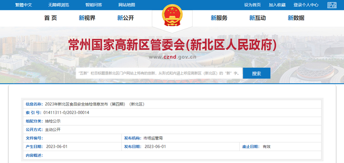 中国质量新闻网讯 据江苏常州高新区管委会(新北区人民政府)网站发布的《2023年新北区食品安全抽检信息发布(第四期)(新北区)》,近期,新北区食品安全委员会针对餐饮食品、食用农产品、调味品等21个大类的149批次食品开展抽检工作,发现合格样品147批次,不合格样品2批次。