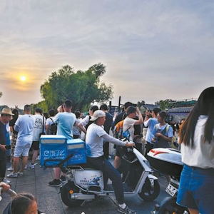 银锭桥横跨什刹海前海、后海细脖处,只有12米长、7米宽,连接着两旁的小石碑胡同和银锭桥胡同。这座桥不仅是一处景点,也是附近居民、游客通行的道路。拍照的游客涌到桥上,把原本不宽的桥面堵住了一大半。骑电动车经过的居民、快递员一边摁着喇叭,一边喊着“往边上走走”(左图),更是让桥上混乱一片。