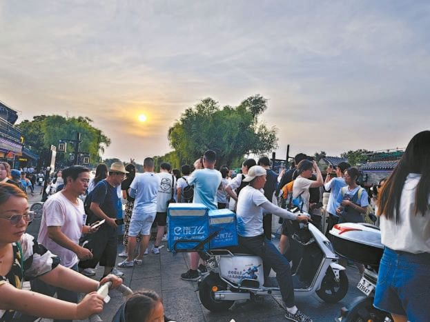 傍晚,记者来到银锭桥旁,只见落日余晖洒在湖面上一片金光,不时有游船从金光中漂过……此时,银锭桥上已经人头攒动、熙熙攘攘,人们纷纷举着手机拍摄下这一美景。不少游客以落日余晖为背景,站在栏杆旁变换着各种拍照姿势,有的一拍就是十多分钟。每当桥面西侧栏杆空出位置,不少路过的骑车人,也被眼前的景致吸引,驻足停车自顾自地照相。