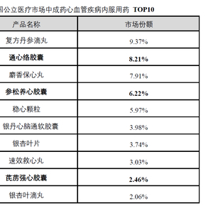 米内网数据显示,通心络胶囊、参松养心胶囊和芪苈强心胶囊在我国2022上半年公立医疗市场中成药心血管疾病内服用药排名中,分别排名第2名、第4名和第9名。
