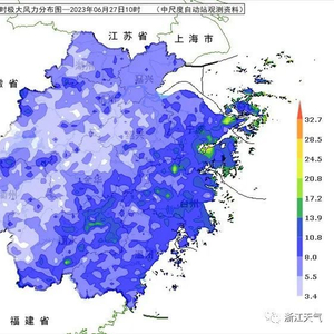 昨日,宁波、台州、丽水、绍兴、衢州、金华、杭州等地局部出现短时强降水和雷暴大风,其中有32个站出现8.0级以上雷暴大风,最大的宁海县白石山达到12级。