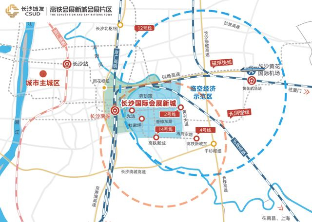 长沙国际会展新城,长沙市东南方向的“门户”,其位置东至黄兴大道,西起浏阳河(含磨盘洲),南至湘府东路(以南500米),北达浏阳河-长沙大道,开发面积为30平方公里;其中,中国(湖南)自贸试验区长沙片区会展区块面积9.84平方公里。
