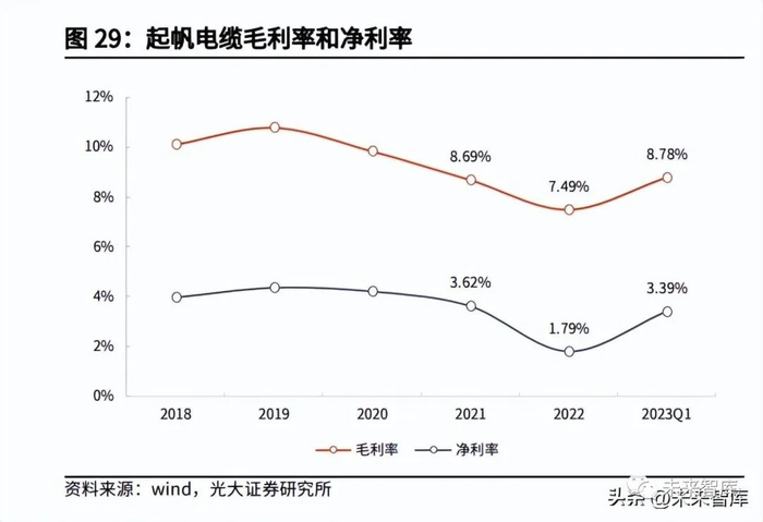 起帆电缆在电线电缆行业深耕近三十年,主要产品包括电力电缆和电气装备用电 线电缆。公司 2022 年实现营收 206.44 亿元,同比增长 9.36%,归母净利润 3.66 亿元,同比下降 46.44%,主要系铜价剧烈波动导致计提存货减值、股权激励费 用摊销、财务费用支出增加所致。公司 2023 年一季度实现营收 45.61 亿元,同 比增长 23.50%,归母净利润 1.54 亿元,同比增长 2.99%。