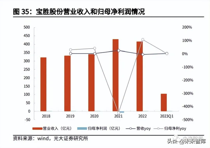 宝胜股份是中国航空工业集团公司旗下的电线电缆企业,覆盖领域包括轨道交 通、航空航天、新能源、通信等。公司 2022 年实现营收 414.82 亿元,同比下 降 3.26%,归母净利润 0.65 亿元,同比扭亏为盈。2021 年亏损的主要原因是客 户资金周转困难,公司对客户应收项目计提减值准备超 10 亿元。2022 年裸导体 和电线电缆业务(包括电力电缆、电气装备用电缆、通信电缆及光缆)板块营收 同比基本持平,而海上风电业务受抢装后海风建设节奏放缓的阶段性影响,营收 同比下降 71.17%至 4.35 亿元,销量约 338 公里。2023 年一季度公司实现营收 104.00 亿元,同比增长 4.16%,归母净利润 0.39 亿元,同比增长 2.85%。
