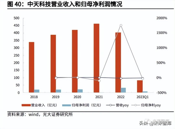 中天科技是国内光电缆高新技术企业,近年来主要聚焦绿色能源、通信网络等领 域。公司 2022 年实现营收 402.71 亿元,同比下降 12.76%,主要受剥离商品贸 易业务影响,实现归母净利润 32.14 亿元,同比增长 1768.60%,主要因为 2021 年公司对高端通信业务风险资产 100%计提减值准备 36.19 亿元。公司 2023 年 一季度实现营收 82.75 亿元,同比下降 10.92%,实现归母净利润 7.68 亿元, 同比下降 24.36%。